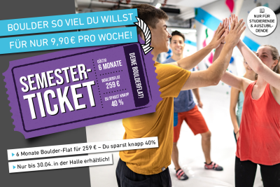 Jetzt clever sparen und bouldern so viel Du willst, für nur 9,90 € die Woche! Hol Dir das Sommer-Semesterticket und bouldere 6 Monate lang für nur 259 €!