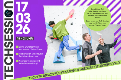 Du suchst den richtigen (Wieder-)Einstieg ins Bouldern? Nutze die Chance und sei am Dienstag den 17.03. dabei! Lerne von unseren Trainer*innen und probiere Dich an unseren Technikstationen aus.